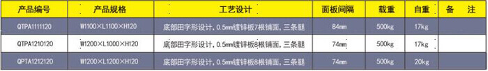 產(chǎn)品編號(hào):QTPA1111120 產(chǎn)品規(guī)格:W1100×L1100×H120 托盤(pán)主孔:100mm 托盤(pán)側(cè)孔:80 mm 產(chǎn)品自重:16 kg 產(chǎn)品靜載:800kg 產(chǎn)品動(dòng)載:600kg 上貨架載:不建議 產(chǎn)品配置:采用寶鋼鍍鋅板軋機(jī)成0.5*10*85 多筋骨面板10根,以間隔84mm 和6根板做腿+9個(gè)立撐組成。 產(chǎn)品用途:廣泛用于酒水、食品、化工、電子 等大量物品倉(cāng)儲(chǔ)與周轉(zhuǎn)。 產(chǎn)品缺陷:不宜上貨架。